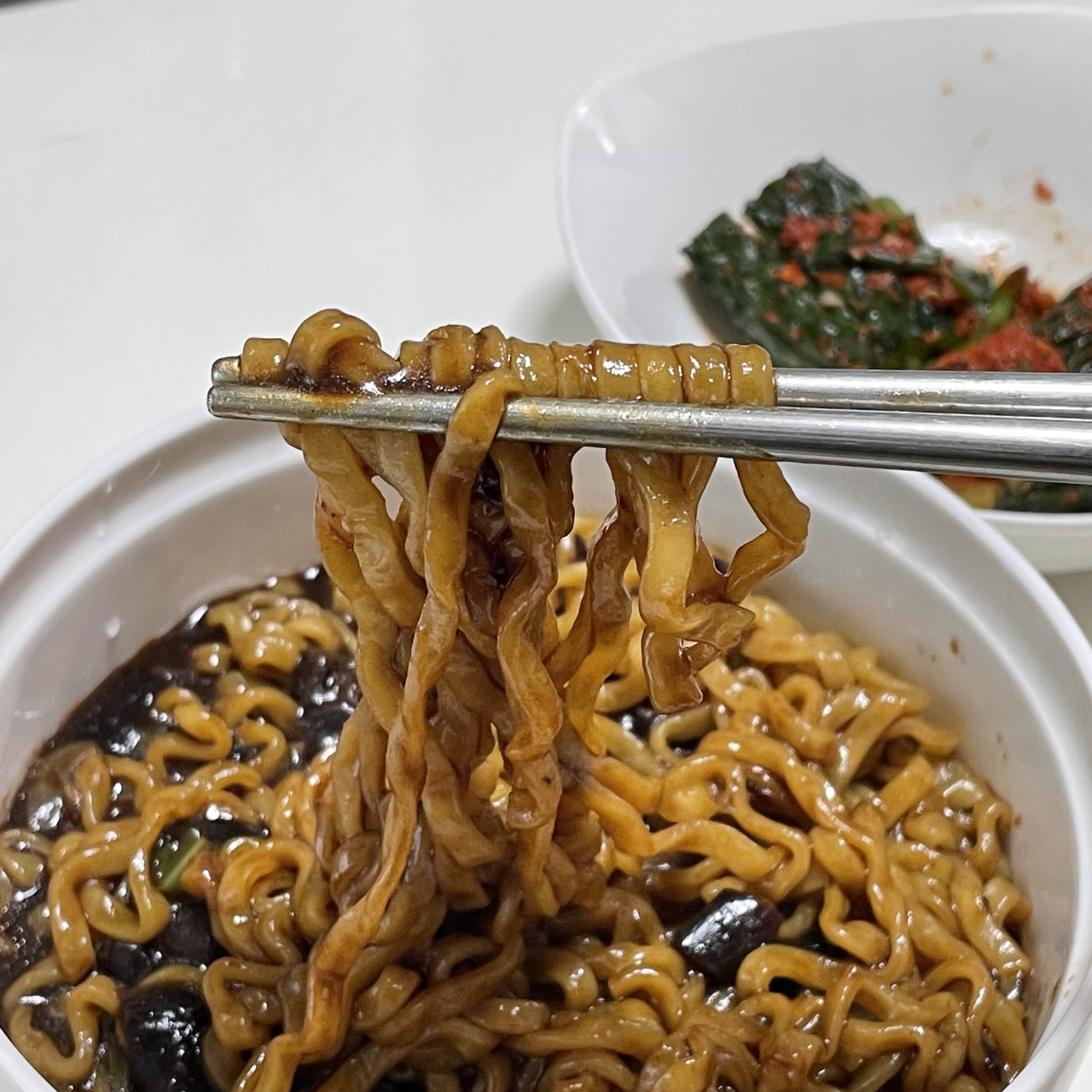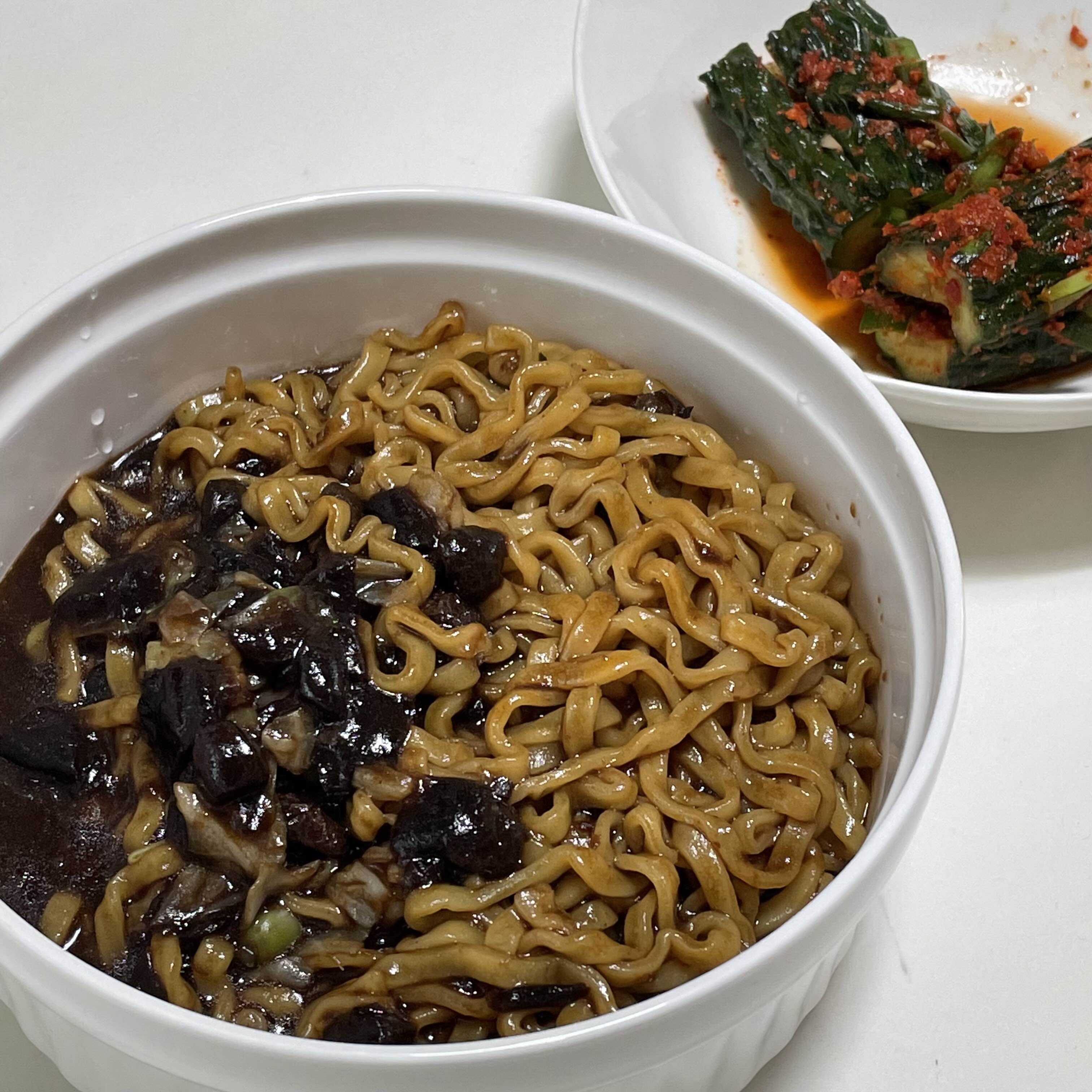 실제 고기건더기도 있어 씹는 맛이 조금 더 살아나는 짜장면입니다. 오이소박이와 함께먹으니 잘 어우러졌습니다. 팔도 짜장면은 집에서도 중화 짜장면의 고급진 맛을 느낄 수 있는 제품인듯합니다.